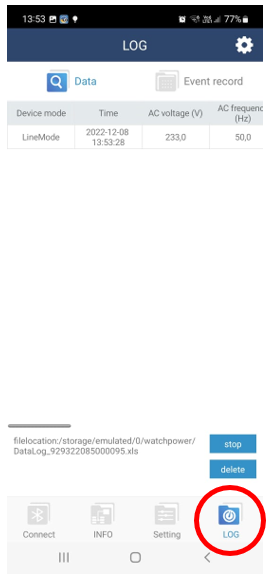 Log menu, you are able to start a Data and event log . Which will stored on your cellphone in a XLS format