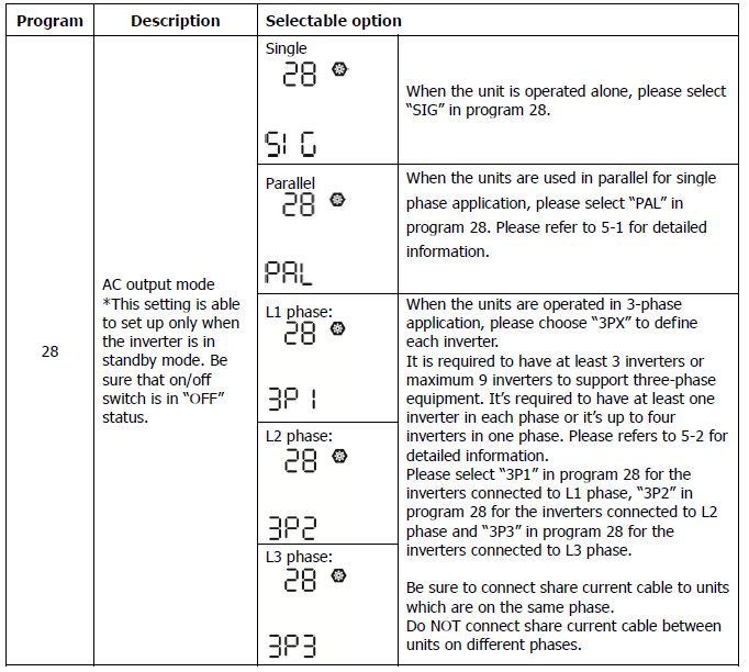 Program/Parameter 28: For units used in parallel on a single phase - this parameter needs to be set to "PAL".