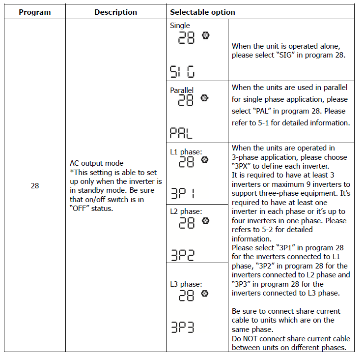 Program/Parameter 28: For units used in parallel on a single phase - this parameter needs to be set to "PAL".