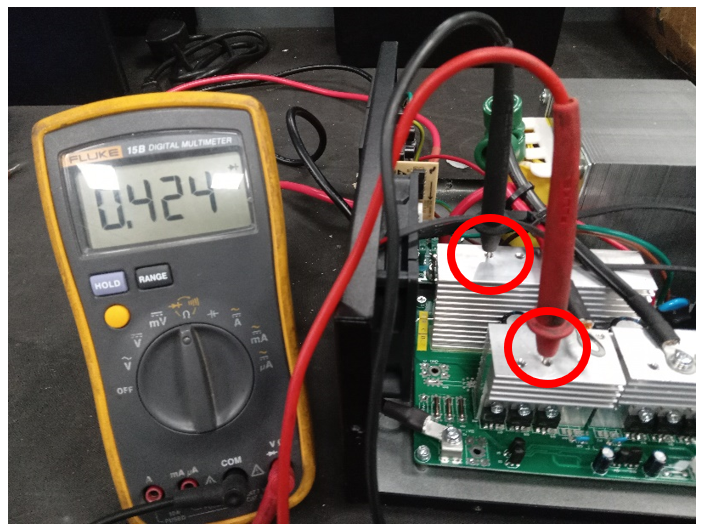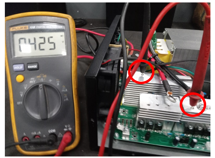 Place the positive test lead on the 1st heatsink of DC to DC bus and the negative test lead on the AC bus heatsink.