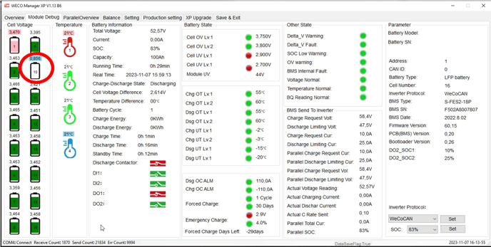 You can do this by connecting the Weco battery to the Weco Manager XP software on your laptop. Under the Module Debug screen it will show you in detail each cell voltage.
