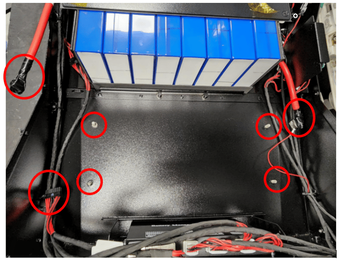 After disconnecting and isolating the 2 Power leads going to the bottom cell bank as well as the communication cables going to the BMS, you can use the 10-socket driver to remove the bottom bank of cells.