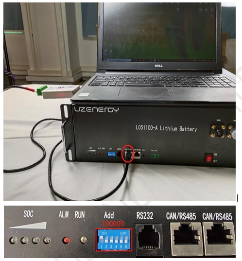 Connect the computer and Power Lite via RS485/USB converter. Set the external dial-up address of battery to 100000.