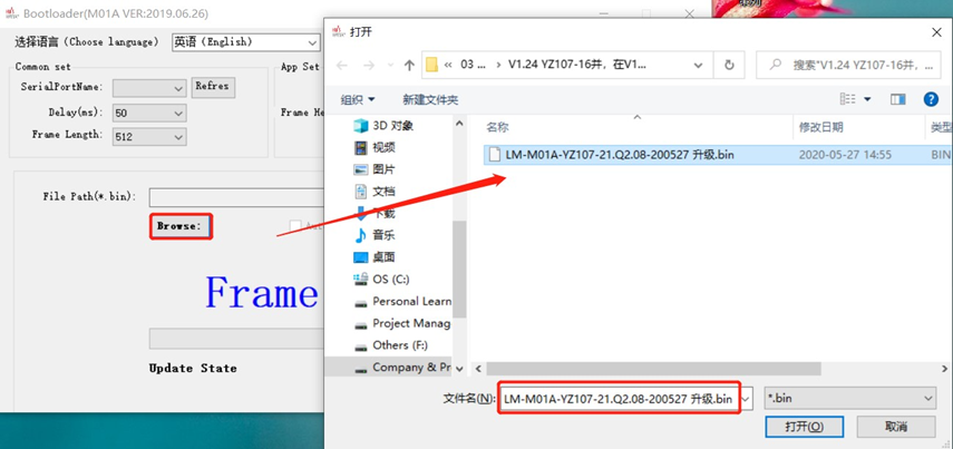 Once the software is opened, Click on the “Browse” button and select the target BMS firmware for upgrading. [The target firmware is LM-M01A-YZ107-21.Q2.14-210109] NB _ LEAVE TOOL IN CHINESE