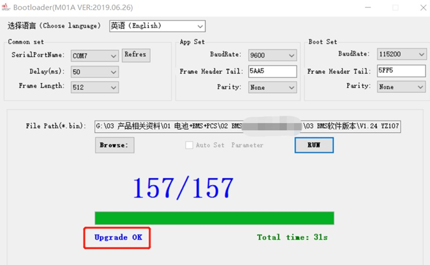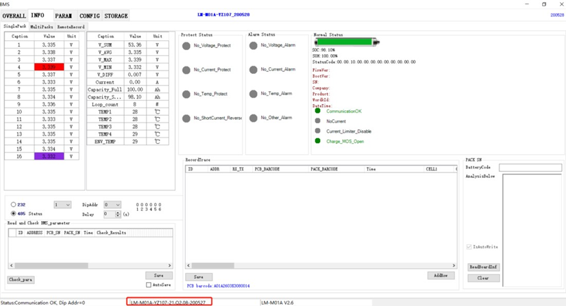 When communication is OK, the version of the current BMS program which should be consistent with the target one for upgrading which can be identified at the bottom of the software interface. If the version of the program is not right, please upgrade it as software upgrading procedure. [The target firmware is LM-M01A-YZ107-21.Q2.14-210109]