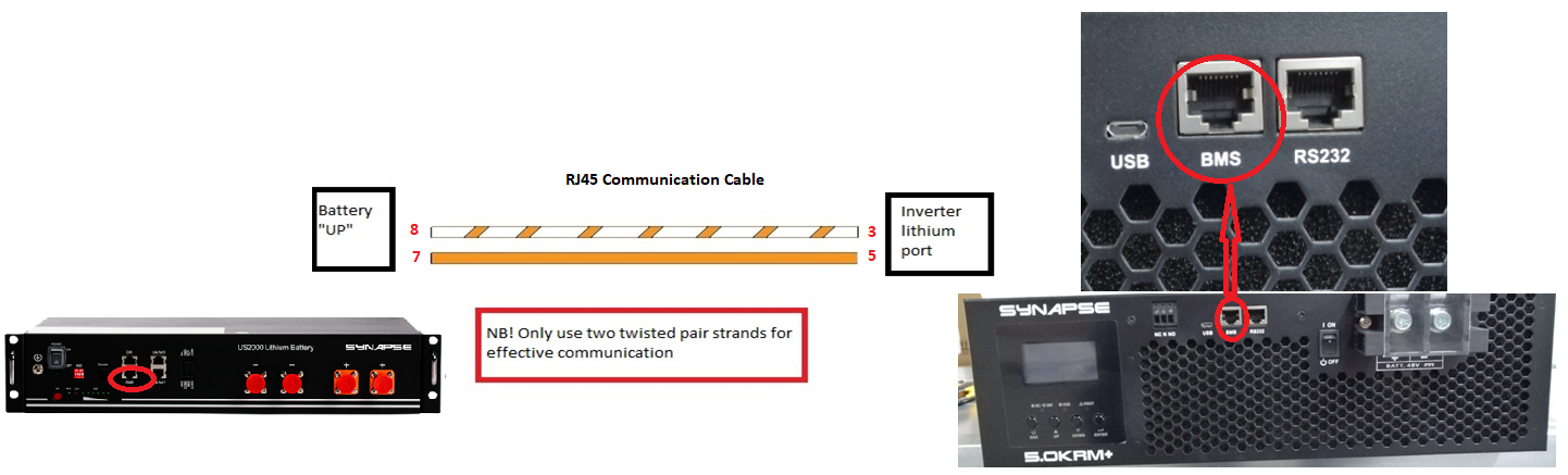 The following is the correct wiring for the communications between the Pylontech/Synapse batteries and a Synapse rack mount+ inverter: